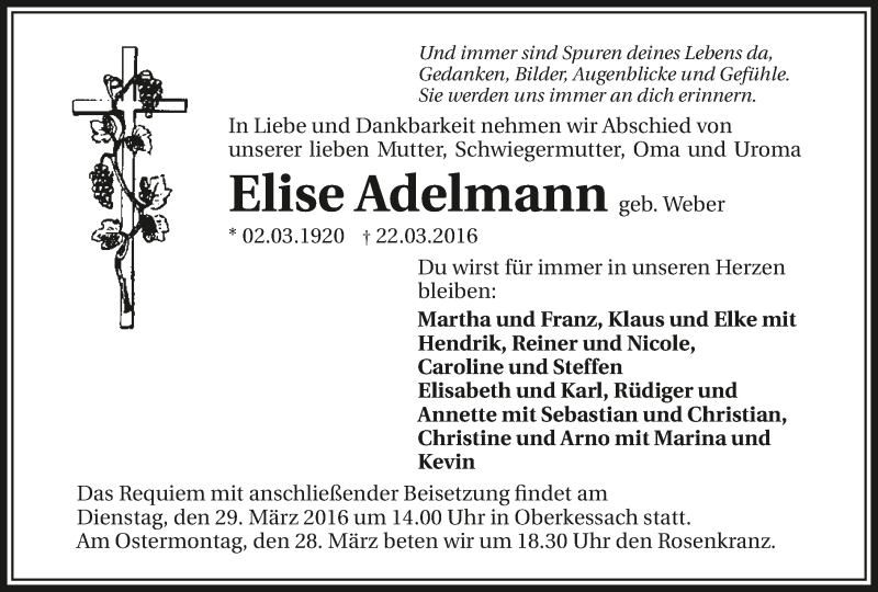 Hier finden Sie alle Traueranzeigen aus der Zeitung, die bisher für Elise Adelmann erschienen sind. Weitere Traueranzeigen, die in der Zeitung erscheinen, werden hier ebenfalls aufgelistet