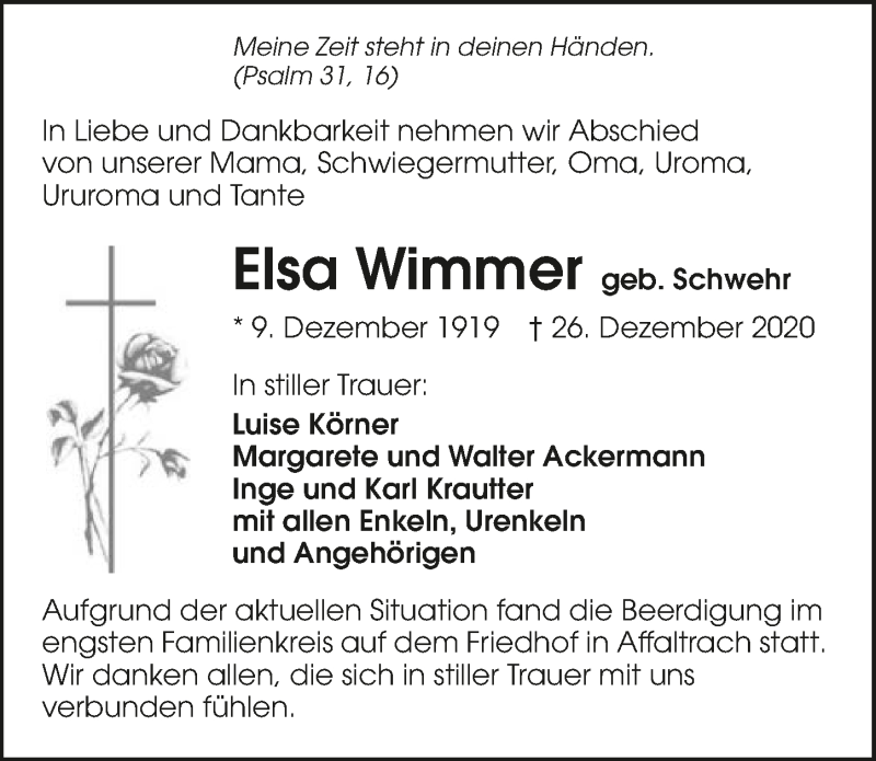 Hier finden Sie alle Traueranzeigen aus der Zeitung, die bisher für Elsa Wimmer erschienen sind. Weitere Traueranzeigen, die in der Zeitung erscheinen, werden hier ebenfalls aufgelistet