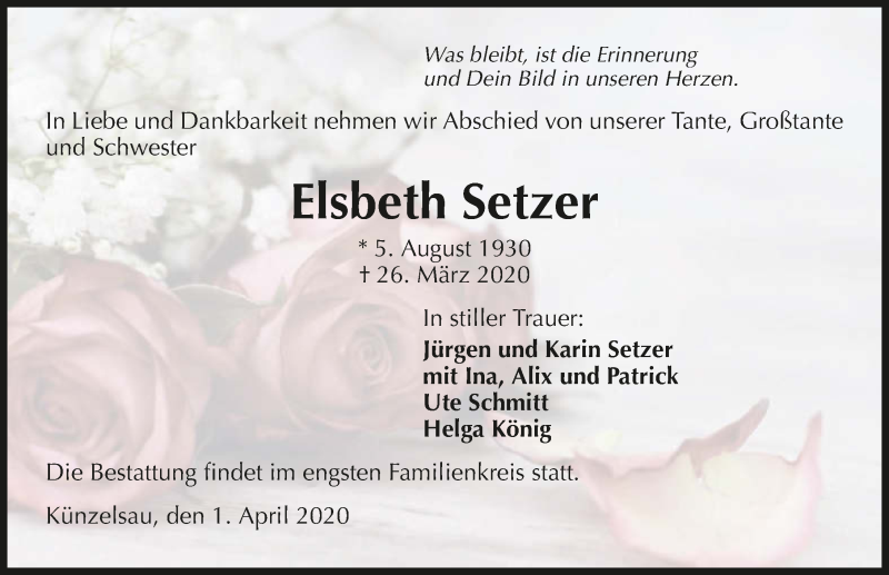 Hier finden Sie alle Traueranzeigen aus der Zeitung, die bisher für Elsbeth Setzer erschienen sind. Weitere Traueranzeigen, die in der Zeitung erscheinen, werden hier ebenfalls aufgelistet