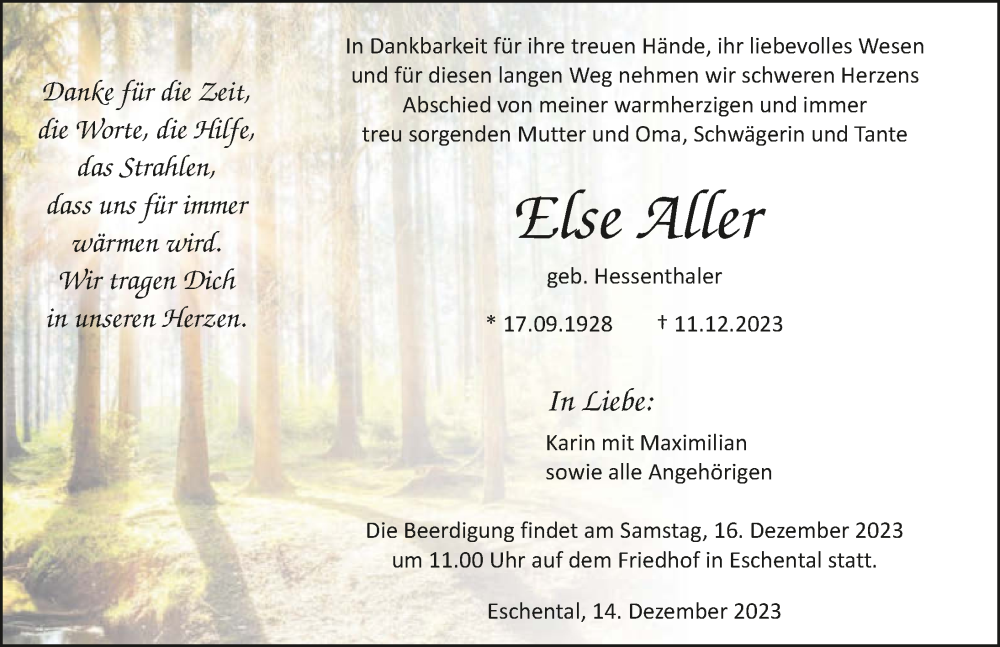 Hier finden Sie alle Traueranzeigen aus der Zeitung, die bisher für Else Aller erschienen sind. Weitere Traueranzeigen, die in der Zeitung erscheinen, werden hier ebenfalls aufgelistet