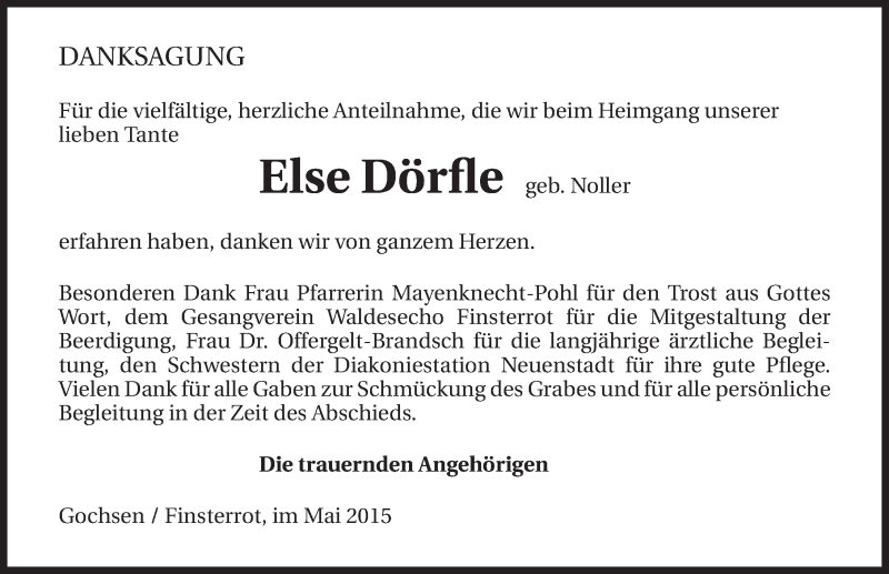 Hier finden Sie alle Traueranzeigen aus der Zeitung, die bisher für Else Dörfle erschienen sind. Weitere Traueranzeigen, die in der Zeitung erscheinen, werden hier ebenfalls aufgelistet