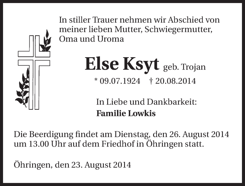 Hier finden Sie alle Traueranzeigen aus der Zeitung, die bisher für Else Ksyt erschienen sind. Weitere Traueranzeigen, die in der Zeitung erscheinen, werden hier ebenfalls aufgelistet
