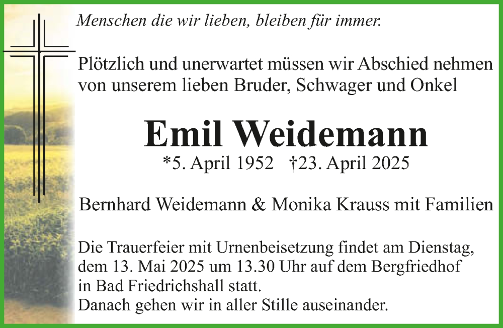 Hier finden Sie alle Traueranzeigen aus der Zeitung, die bisher für Emil Weidemann erschienen sind. Weitere Traueranzeigen, die in der Zeitung erscheinen, werden hier ebenfalls aufgelistet