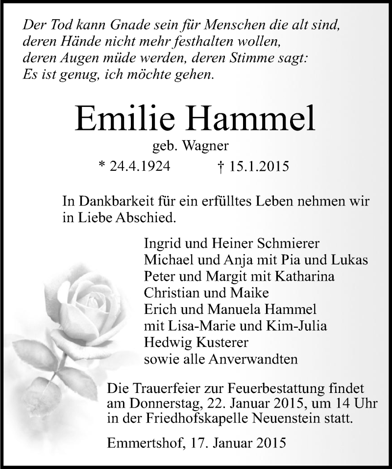 Hier finden Sie alle Traueranzeigen aus der Zeitung, die bisher für Emilie Hammel erschienen sind. Weitere Traueranzeigen, die in der Zeitung erscheinen, werden hier ebenfalls aufgelistet