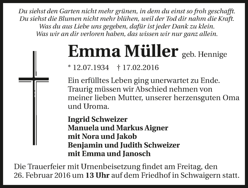 Hier finden Sie alle Traueranzeigen aus der Zeitung, die bisher für Emma Müller erschienen sind. Weitere Traueranzeigen, die in der Zeitung erscheinen, werden hier ebenfalls aufgelistet