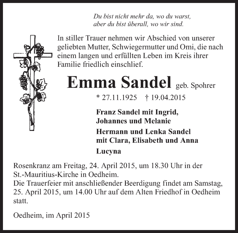 Hier finden Sie alle Traueranzeigen aus der Zeitung, die bisher für Emma Sandel erschienen sind. Weitere Traueranzeigen, die in der Zeitung erscheinen, werden hier ebenfalls aufgelistet
