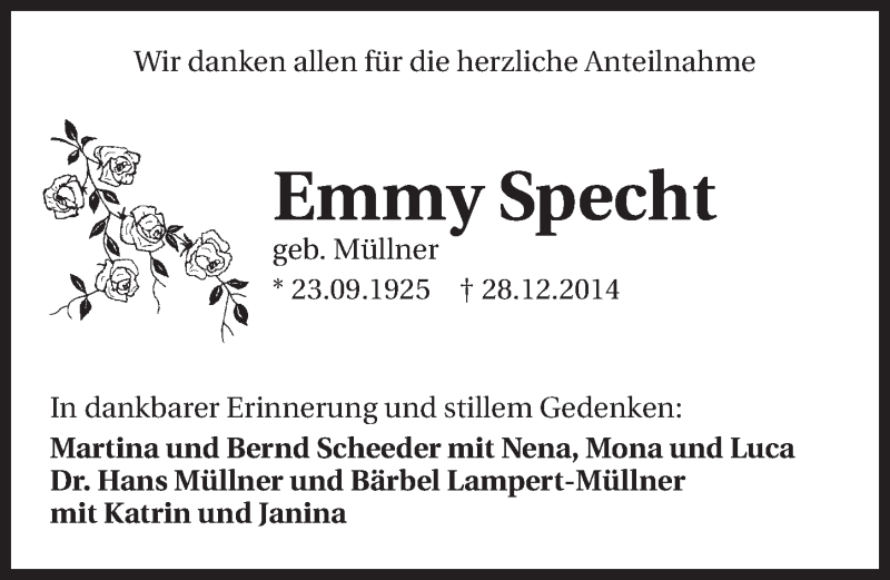 Hier finden Sie alle Traueranzeigen aus der Zeitung, die bisher für Emmy Specht erschienen sind. Weitere Traueranzeigen, die in der Zeitung erscheinen, werden hier ebenfalls aufgelistet