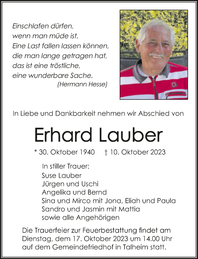 Hier finden Sie alle Traueranzeigen aus der Zeitung, die bisher für Erhard Lauber erschienen sind. Weitere Traueranzeigen, die in der Zeitung erscheinen, werden hier ebenfalls aufgelistet