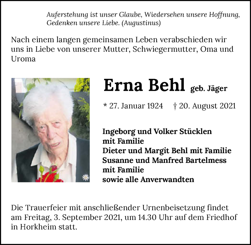 Hier finden Sie alle Traueranzeigen aus der Zeitung, die bisher für Erna Behl erschienen sind. Weitere Traueranzeigen, die in der Zeitung erscheinen, werden hier ebenfalls aufgelistet