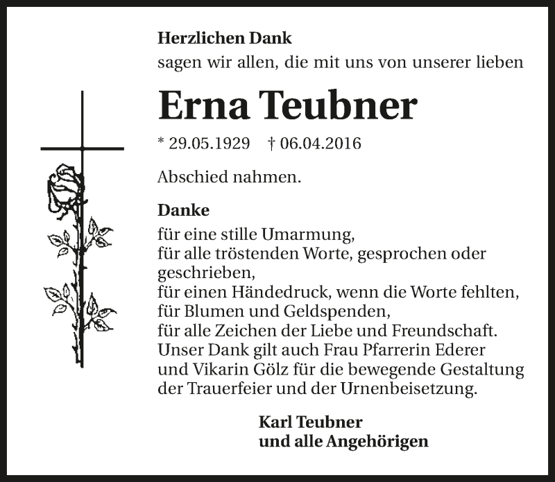 Hier finden Sie alle Traueranzeigen aus der Zeitung, die bisher für Erna Teubner erschienen sind. Weitere Traueranzeigen, die in der Zeitung erscheinen, werden hier ebenfalls aufgelistet