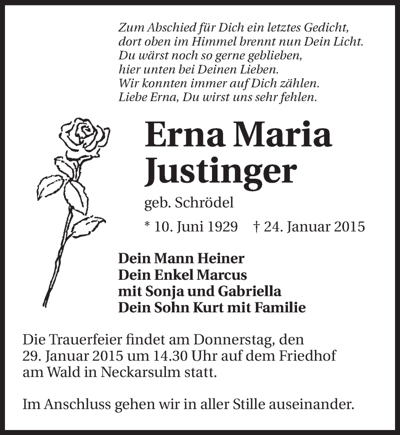 Hier finden Sie alle Traueranzeigen aus der Zeitung, die bisher für Erna Maria Justinger erschienen sind. Weitere Traueranzeigen, die in der Zeitung erscheinen, werden hier ebenfalls aufgelistet