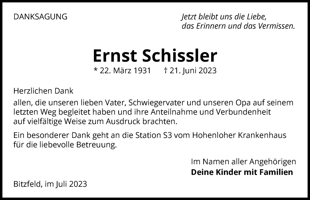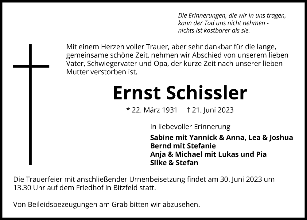 Hier finden Sie alle Traueranzeigen aus der Zeitung, die bisher für Ernst Schissler erschienen sind. Weitere Traueranzeigen, die in der Zeitung erscheinen, werden hier ebenfalls aufgelistet