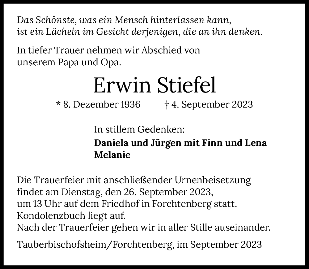 Hier finden Sie alle Traueranzeigen aus der Zeitung, die bisher für Erwin Stiefel erschienen sind. Weitere Traueranzeigen, die in der Zeitung erscheinen, werden hier ebenfalls aufgelistet