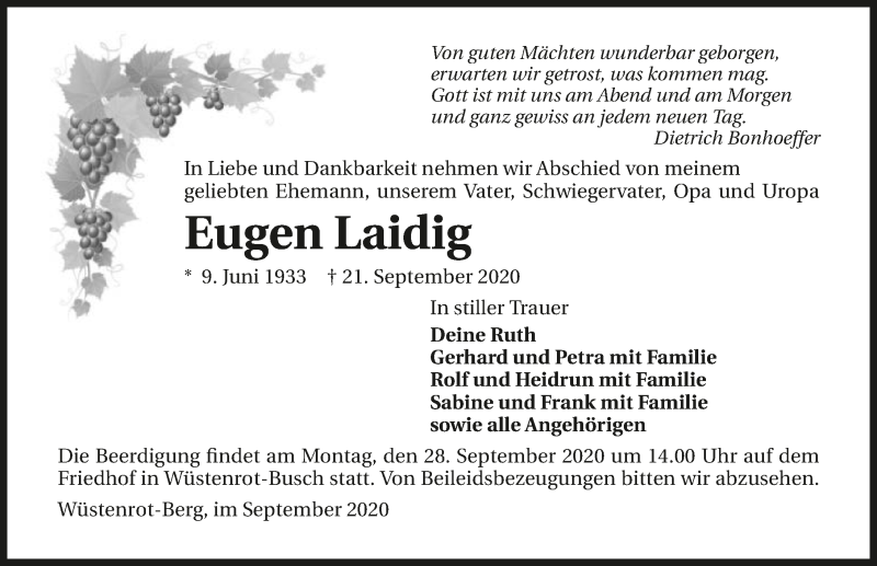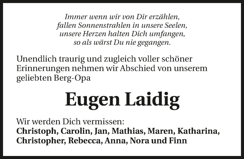 Hier finden Sie alle Traueranzeigen aus der Zeitung, die bisher für Eugen Laidig erschienen sind. Weitere Traueranzeigen, die in der Zeitung erscheinen, werden hier ebenfalls aufgelistet
