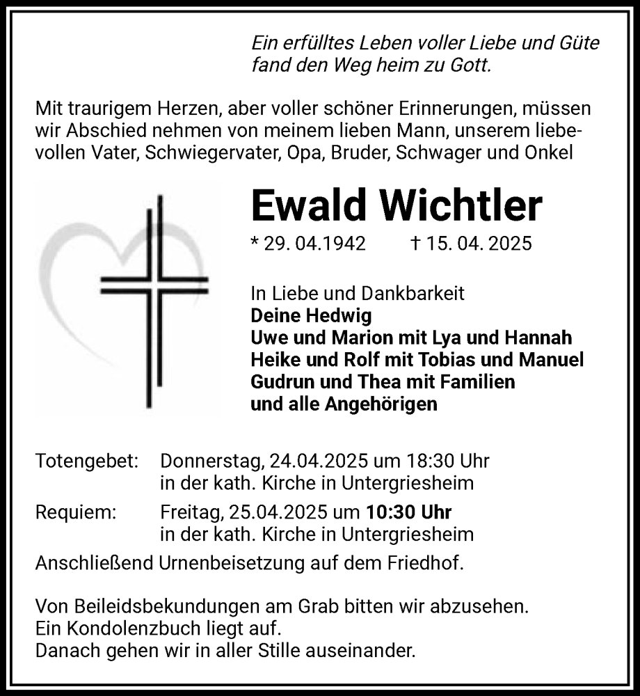 Hier finden Sie alle Traueranzeigen aus der Zeitung, die bisher für Ewald Wichtler erschienen sind. Weitere Traueranzeigen, die in der Zeitung erscheinen, werden hier ebenfalls aufgelistet