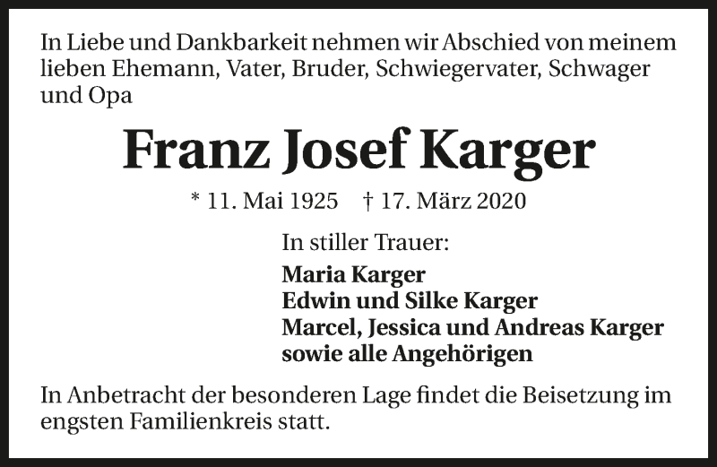 Hier finden Sie alle Traueranzeigen aus der Zeitung, die bisher für Franz Josef Karger erschienen sind. Weitere Traueranzeigen, die in der Zeitung erscheinen, werden hier ebenfalls aufgelistet