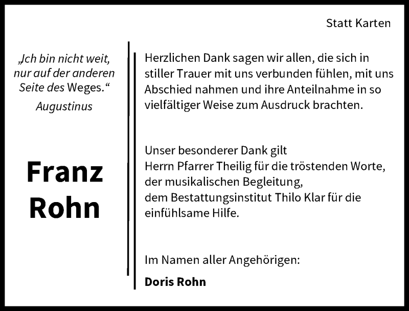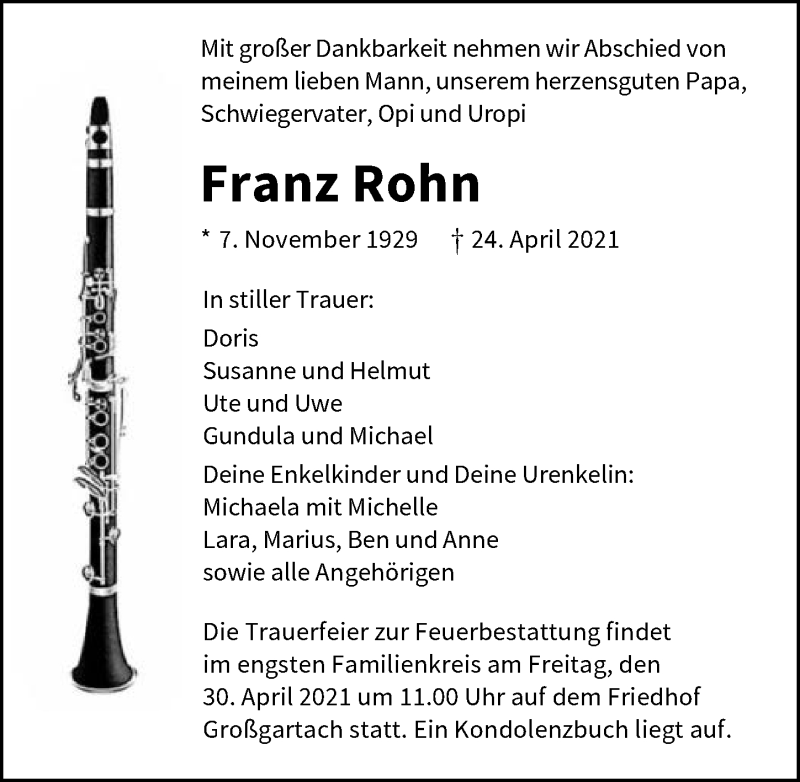 Hier finden Sie alle Traueranzeigen aus der Zeitung, die bisher für Franz Rohn erschienen sind. Weitere Traueranzeigen, die in der Zeitung erscheinen, werden hier ebenfalls aufgelistet