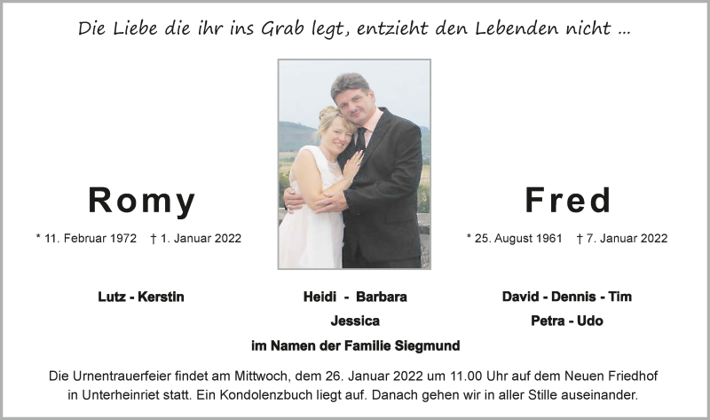 Hier finden Sie alle Traueranzeigen aus der Zeitung, die bisher für Fred erschienen sind. Weitere Traueranzeigen, die in der Zeitung erscheinen, werden hier ebenfalls aufgelistet