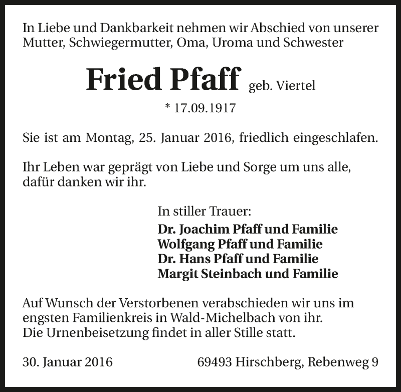 Hier finden Sie alle Traueranzeigen aus der Zeitung, die bisher für Fried Pfaff erschienen sind. Weitere Traueranzeigen, die in der Zeitung erscheinen, werden hier ebenfalls aufgelistet