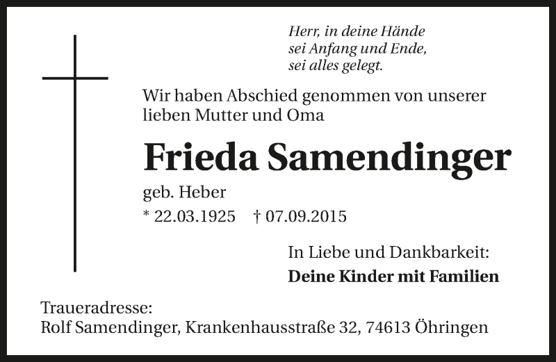 Hier finden Sie alle Traueranzeigen aus der Zeitung, die bisher für Frieda Samendinger erschienen sind. Weitere Traueranzeigen, die in der Zeitung erscheinen, werden hier ebenfalls aufgelistet