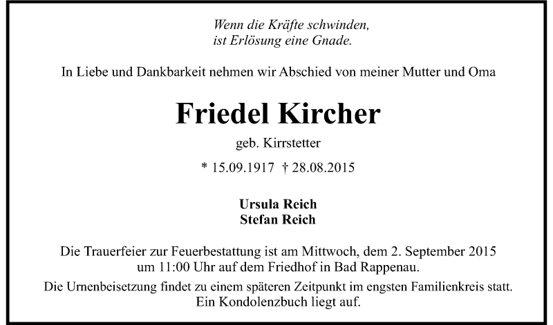Hier finden Sie alle Traueranzeigen aus der Zeitung, die bisher für Friedel Kircher erschienen sind. Weitere Traueranzeigen, die in der Zeitung erscheinen, werden hier ebenfalls aufgelistet