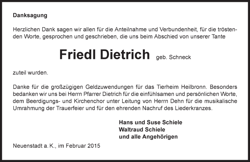 Hier finden Sie alle Traueranzeigen aus der Zeitung, die bisher für Friedl Dietrich erschienen sind. Weitere Traueranzeigen, die in der Zeitung erscheinen, werden hier ebenfalls aufgelistet