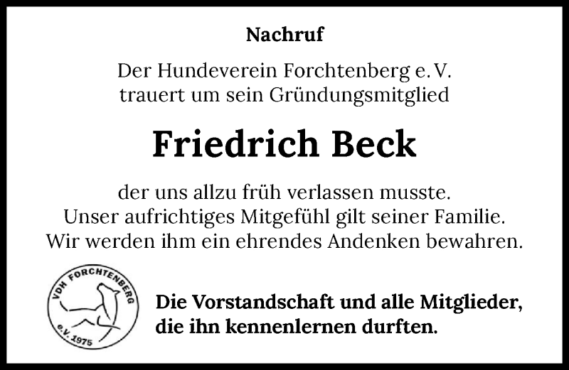 Hier finden Sie alle Traueranzeigen aus der Zeitung, die bisher für Friedrich Beck erschienen sind. Weitere Traueranzeigen, die in der Zeitung erscheinen, werden hier ebenfalls aufgelistet