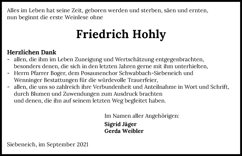 Hier finden Sie alle Traueranzeigen aus der Zeitung, die bisher für Friedrich Hohly erschienen sind. Weitere Traueranzeigen, die in der Zeitung erscheinen, werden hier ebenfalls aufgelistet