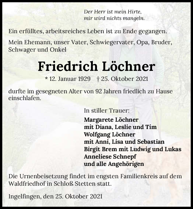 Hier finden Sie alle Traueranzeigen aus der Zeitung, die bisher für Friedrich Löchner erschienen sind. Weitere Traueranzeigen, die in der Zeitung erscheinen, werden hier ebenfalls aufgelistet