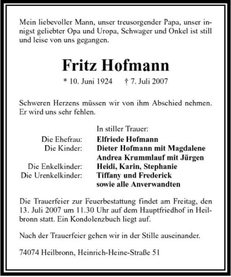 Hier finden Sie alle Traueranzeigen aus der Zeitung, die bisher für Fritz Hofmann erschienen sind. Weitere Traueranzeigen, die in der Zeitung erscheinen, werden hier ebenfalls aufgelistet