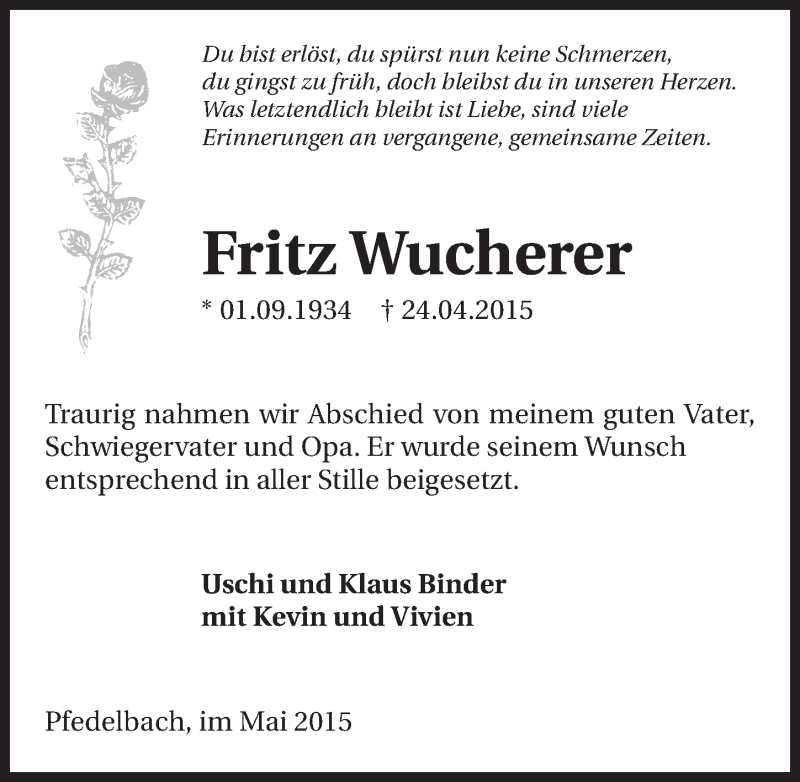 Hier finden Sie alle Traueranzeigen aus der Zeitung, die bisher für Fritz Wucherer erschienen sind. Weitere Traueranzeigen, die in der Zeitung erscheinen, werden hier ebenfalls aufgelistet