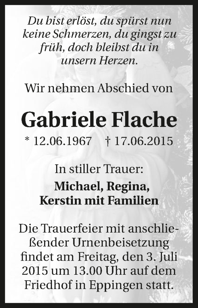 Hier finden Sie alle Traueranzeigen aus der Zeitung, die bisher für Gabriele Flache erschienen sind. Weitere Traueranzeigen, die in der Zeitung erscheinen, werden hier ebenfalls aufgelistet