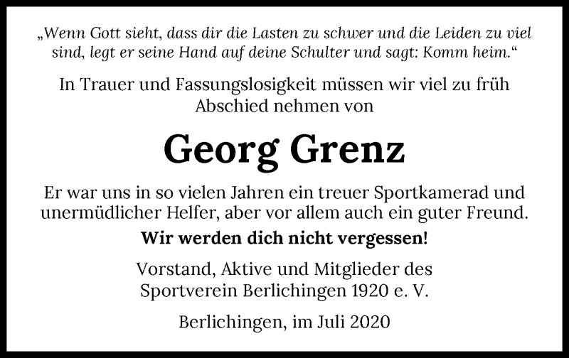 Hier finden Sie alle Traueranzeigen aus der Zeitung, die bisher für Georg Grenz erschienen sind. Weitere Traueranzeigen, die in der Zeitung erscheinen, werden hier ebenfalls aufgelistet