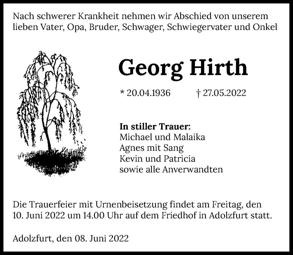 Hier finden Sie alle Traueranzeigen aus der Zeitung, die bisher für Georg Hirth erschienen sind. Weitere Traueranzeigen, die in der Zeitung erscheinen, werden hier ebenfalls aufgelistet