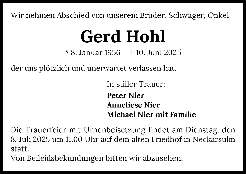 Hier finden Sie alle Traueranzeigen aus der Zeitung, die bisher für Gerd Hohl erschienen sind. Weitere Traueranzeigen, die in der Zeitung erscheinen, werden hier ebenfalls aufgelistet