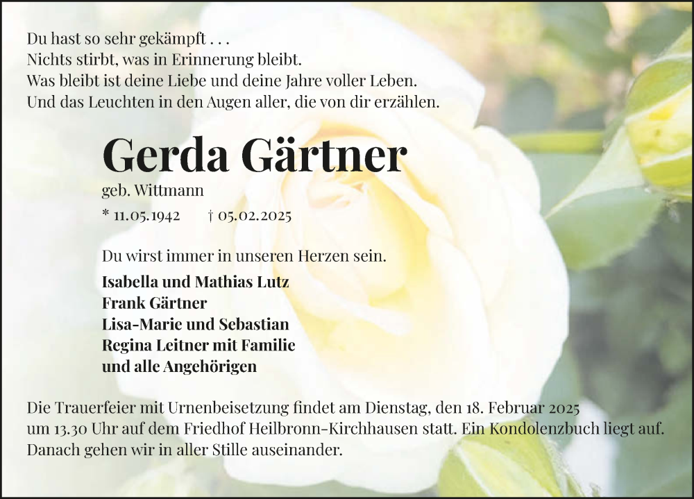 Hier finden Sie alle Traueranzeigen aus der Zeitung, die bisher für Gerda Gärtner erschienen sind. Weitere Traueranzeigen, die in der Zeitung erscheinen, werden hier ebenfalls aufgelistet