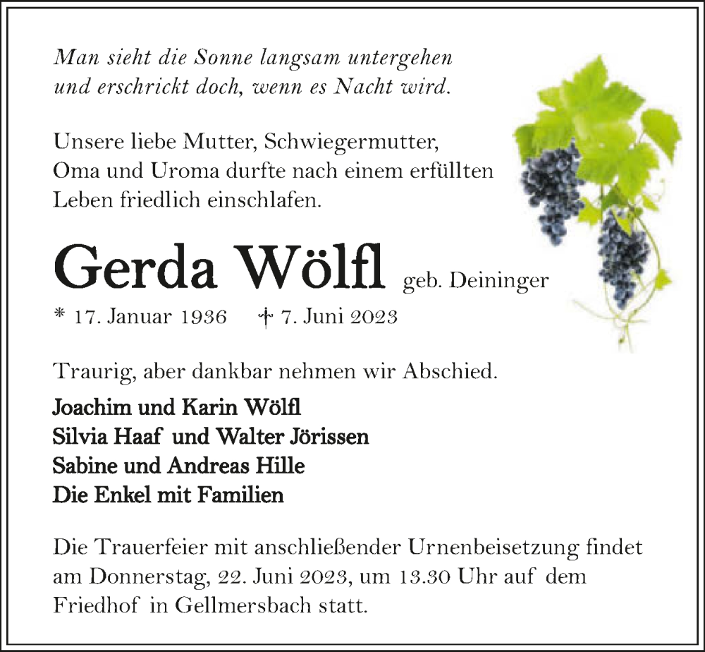 Hier finden Sie alle Traueranzeigen aus der Zeitung, die bisher für Gerda Wölfl erschienen sind. Weitere Traueranzeigen, die in der Zeitung erscheinen, werden hier ebenfalls aufgelistet