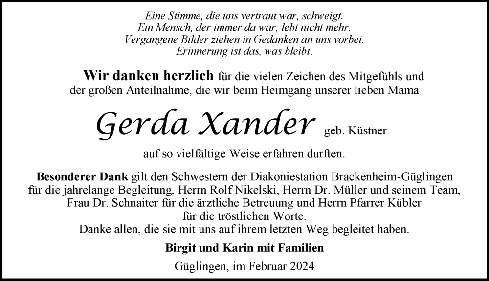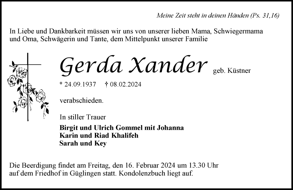Hier finden Sie alle Traueranzeigen aus der Zeitung, die bisher für Gerda Xander erschienen sind. Weitere Traueranzeigen, die in der Zeitung erscheinen, werden hier ebenfalls aufgelistet