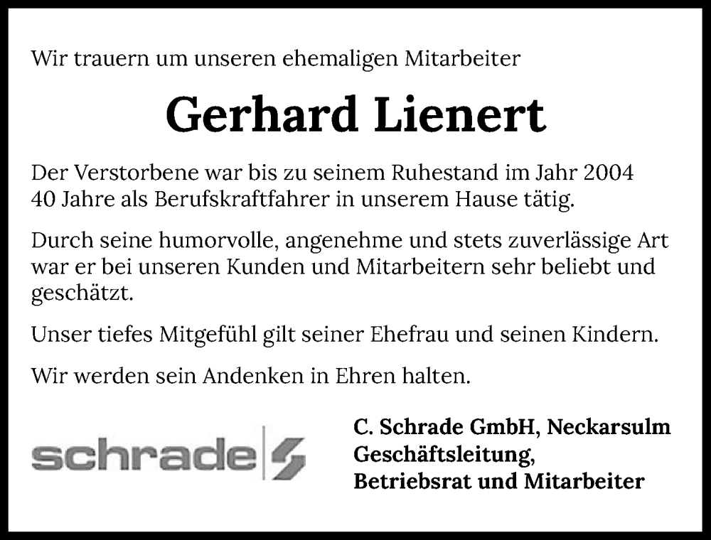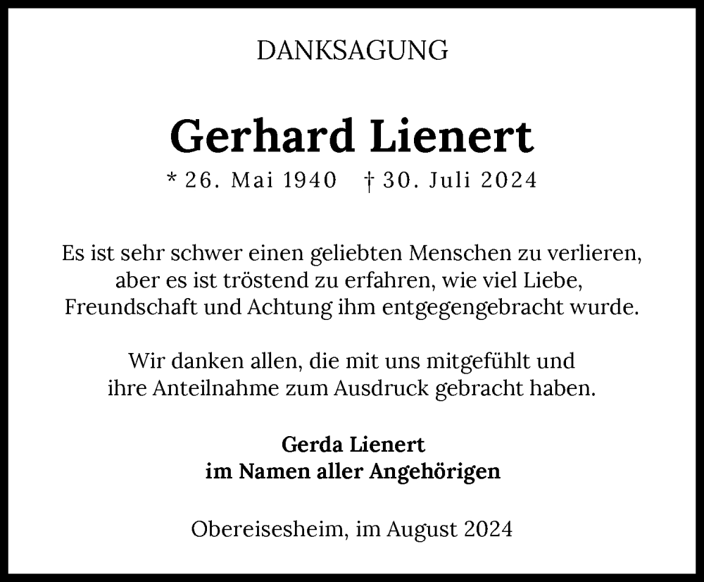 Hier finden Sie alle Traueranzeigen aus der Zeitung, die bisher für Gerhard Lienert erschienen sind. Weitere Traueranzeigen, die in der Zeitung erscheinen, werden hier ebenfalls aufgelistet