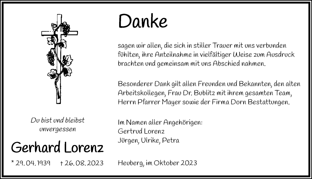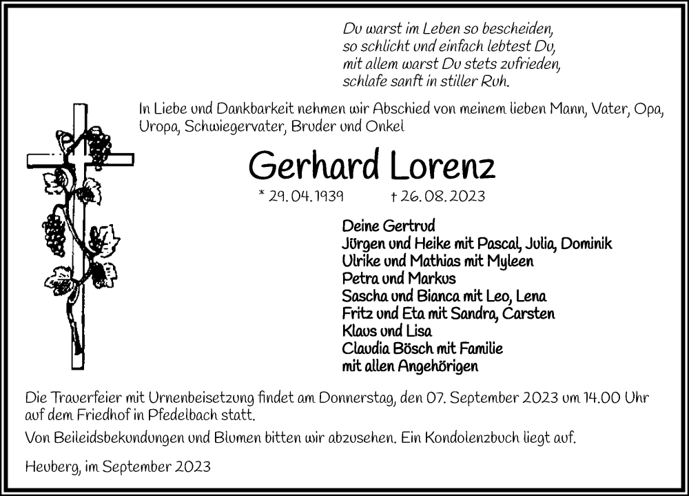 Hier finden Sie alle Traueranzeigen aus der Zeitung, die bisher für Gerhard Lorenz erschienen sind. Weitere Traueranzeigen, die in der Zeitung erscheinen, werden hier ebenfalls aufgelistet