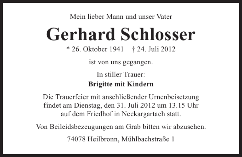 Hier finden Sie alle Traueranzeigen aus der Zeitung, die bisher für Gerhard Schlosser erschienen sind. Weitere Traueranzeigen, die in der Zeitung erscheinen, werden hier ebenfalls aufgelistet