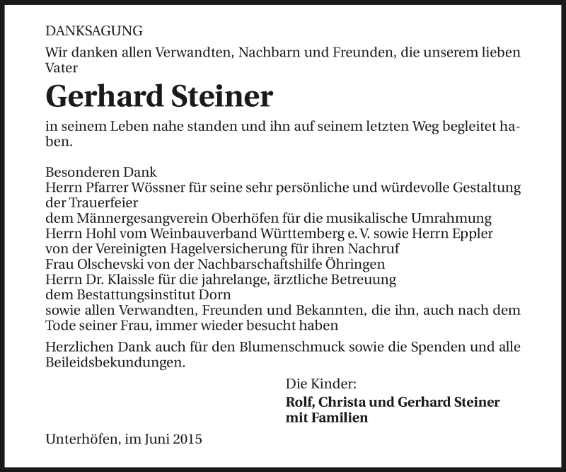 Hier finden Sie alle Traueranzeigen aus der Zeitung, die bisher für Gerhard Steiner erschienen sind. Weitere Traueranzeigen, die in der Zeitung erscheinen, werden hier ebenfalls aufgelistet