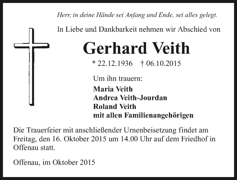 Hier finden Sie alle Traueranzeigen aus der Zeitung, die bisher für Gerhard Veith erschienen sind. Weitere Traueranzeigen, die in der Zeitung erscheinen, werden hier ebenfalls aufgelistet