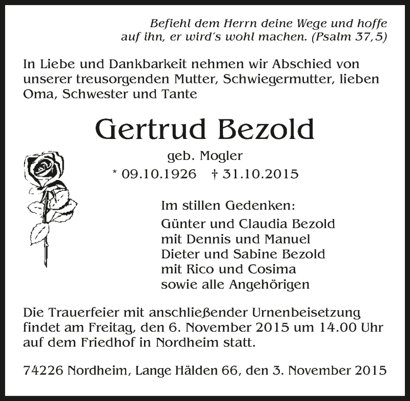 Hier finden Sie alle Traueranzeigen aus der Zeitung, die bisher für Gertrud Bezold erschienen sind. Weitere Traueranzeigen, die in der Zeitung erscheinen, werden hier ebenfalls aufgelistet