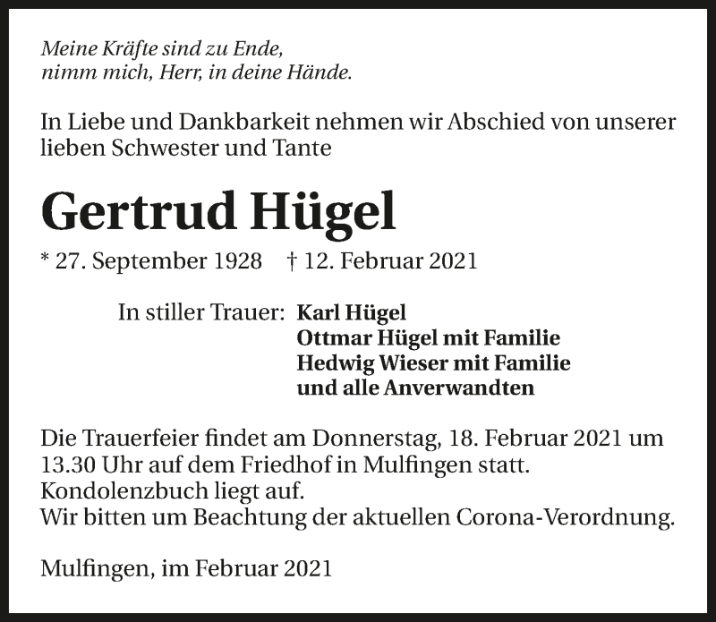 Hier finden Sie alle Traueranzeigen aus der Zeitung, die bisher für Gertrud Hügel erschienen sind. Weitere Traueranzeigen, die in der Zeitung erscheinen, werden hier ebenfalls aufgelistet