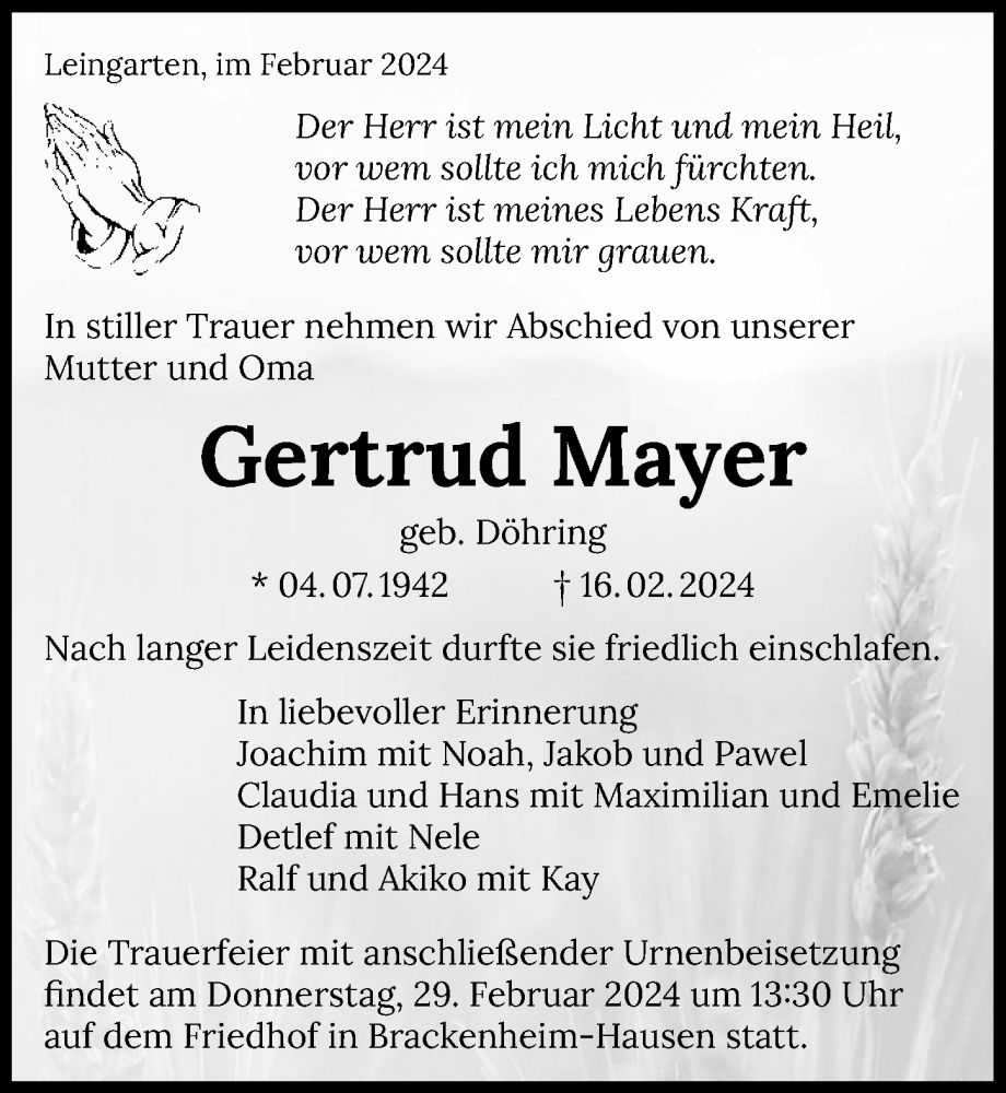 Hier finden Sie alle Traueranzeigen aus der Zeitung, die bisher für Gertrud Mayer erschienen sind. Weitere Traueranzeigen, die in der Zeitung erscheinen, werden hier ebenfalls aufgelistet
