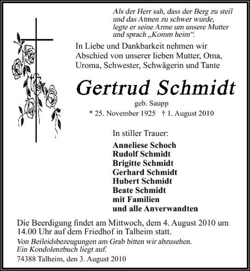 Hier finden Sie alle Traueranzeigen aus der Zeitung, die bisher für Gertrud Schmidt erschienen sind. Weitere Traueranzeigen, die in der Zeitung erscheinen, werden hier ebenfalls aufgelistet