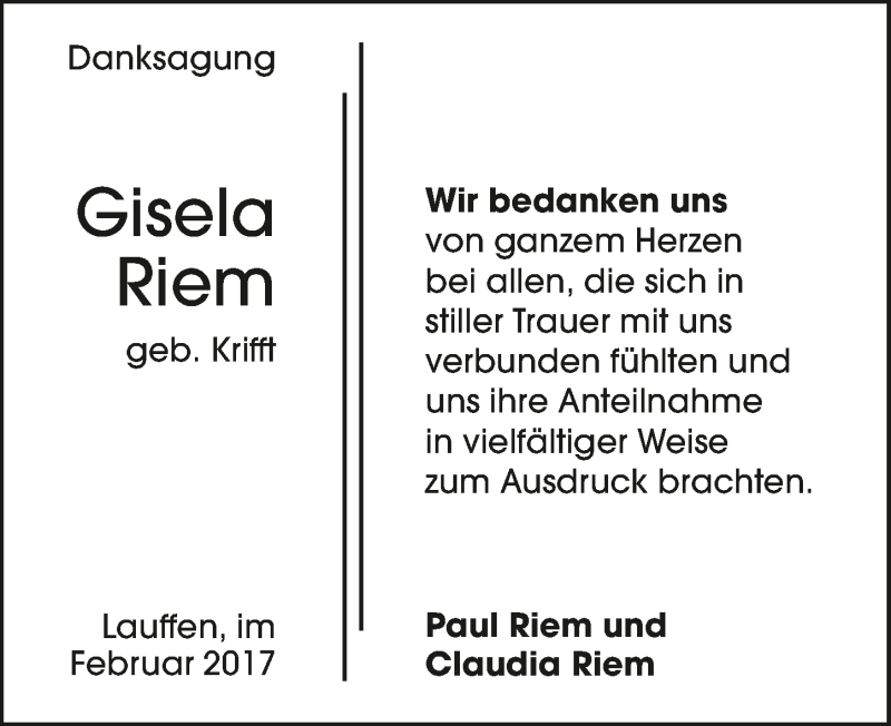 Hier finden Sie alle Traueranzeigen aus der Zeitung, die bisher für Gisela Riem erschienen sind. Weitere Traueranzeigen, die in der Zeitung erscheinen, werden hier ebenfalls aufgelistet