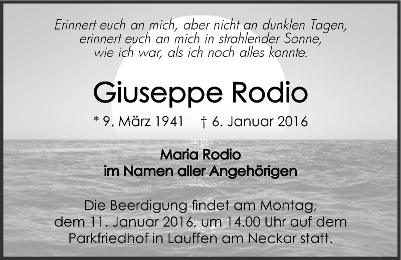Hier finden Sie alle Traueranzeigen aus der Zeitung, die bisher für Giuseppe Rodio erschienen sind. Weitere Traueranzeigen, die in der Zeitung erscheinen, werden hier ebenfalls aufgelistet