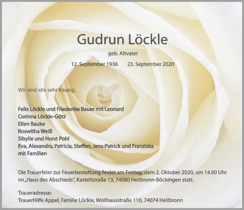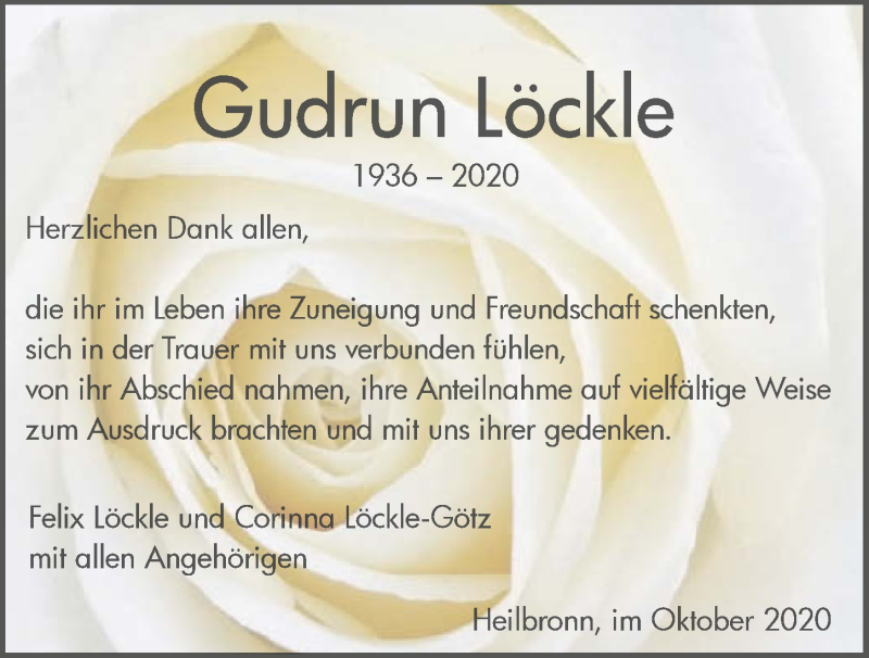 Hier finden Sie alle Traueranzeigen aus der Zeitung, die bisher für Gudrun Löckle erschienen sind. Weitere Traueranzeigen, die in der Zeitung erscheinen, werden hier ebenfalls aufgelistet